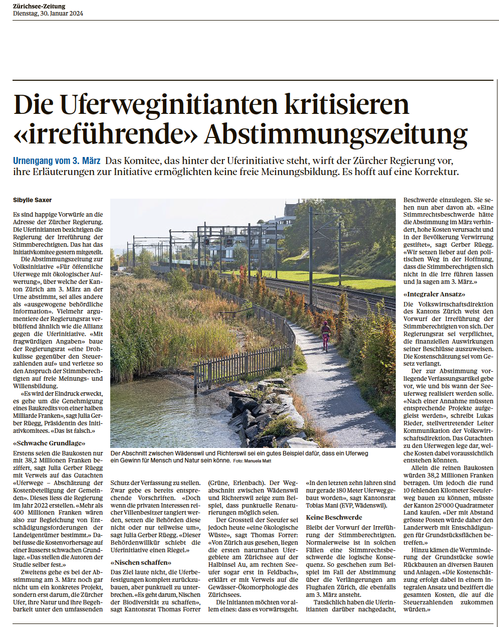 Die Regierung versucht mit falschen Angaben der Kosten, die Uferinitiative zu verhindern. Zu lesen im Artikel in der Zürichsee-Zeitung vom 30. Januar 2024: